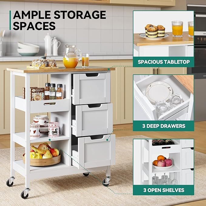 - ENOUGH STORAGE SPACE: The wide top of this rolling storage cabinet can be used as cutting board or stand to put a microwave oven, roaster; 3 open shelves & 3 drawers to classify cutlery, pots, pans & other essentials to keep your culinary space neat & clean for small kitchen & dining room.