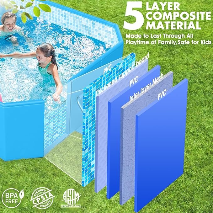- Time-Tested Material Quality:With a tensile strength of 530 PSI and a 5-layer laminated vinyl paired with a high-modulus polyester mesh, Competitors’ single-layer vinyl inflatable pools are ancient relics in comparison. Rigorous material fatigue tests indicate that it can endure over 12,000 cycles of stress without failure, making it 3 times more durable than standard foldable pool materials in the market. This ensures your folding pool stays in mint condition, season after season
