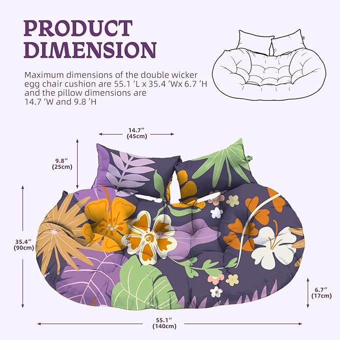 - 【Distinctive Design】:Our double egg chair cushion used purple floral leaf design to give your egg chair cushions a bright, summery feel. This double egg chair cushion with practical strap design can be easily and securely fastened to your chair. The straps prevent the cushion from sliding or shifting, ensuring a stable seating experience